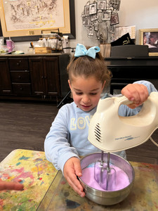 We learned that Pesach is a time when we clean out all the chametz (bread and flour items) from our homes. To bring this to life, we made our soap foam to "clean" with and practiced our broom skills by sweeping up crumbs.
