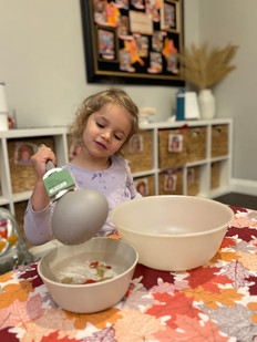 We investigated the inside of pumpkins and used mallets to hammer in golf tees. We scooped fall items and created colorful fall “soup.”